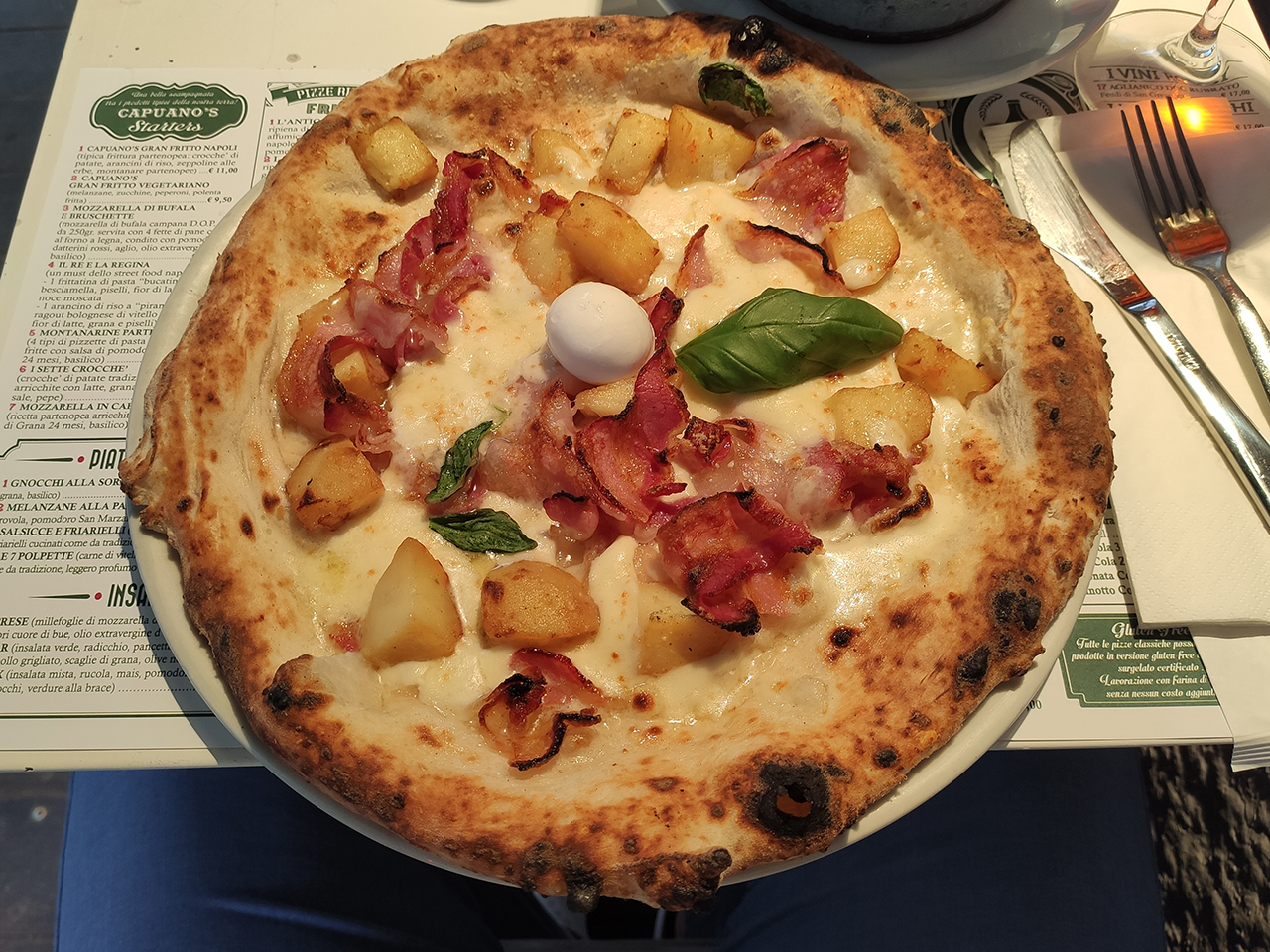 Capuano’s è stata la seconda pizzeria che ho riprovato alla riapertura andando per la precisione nella sede di Via Londonio, sede storica della pizzeria. Di solito io prima di una pizza non prendo mai gli antipasti, ma come fai a dire di no al gran fritto Napoli di Capuano’s ricco di tanti fritti tradizionali napoletani come crocché di patate, arancini di riso, zeppoline e montanare. Dopo aver aperto lo stomaco con questi fritti passiamo alle pizze. La prima pizza doveva essere per forza la mia preferita di Capuano’s ovvero la Contadinella farcita con provola affumicata, patate rustiche cotte al forno, pancetta croccante, grana e basilico. La seconda è un’altra pizza molto famosa nel menù di Capuano’s ma che io non avevo mai provato cioè la Lasagna farcita con salsa di pomodoro San Marzano, ricotta, provola e polpettine di vitello.