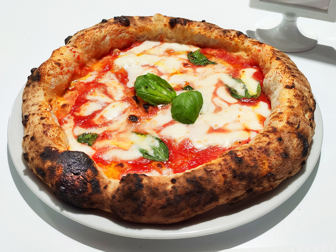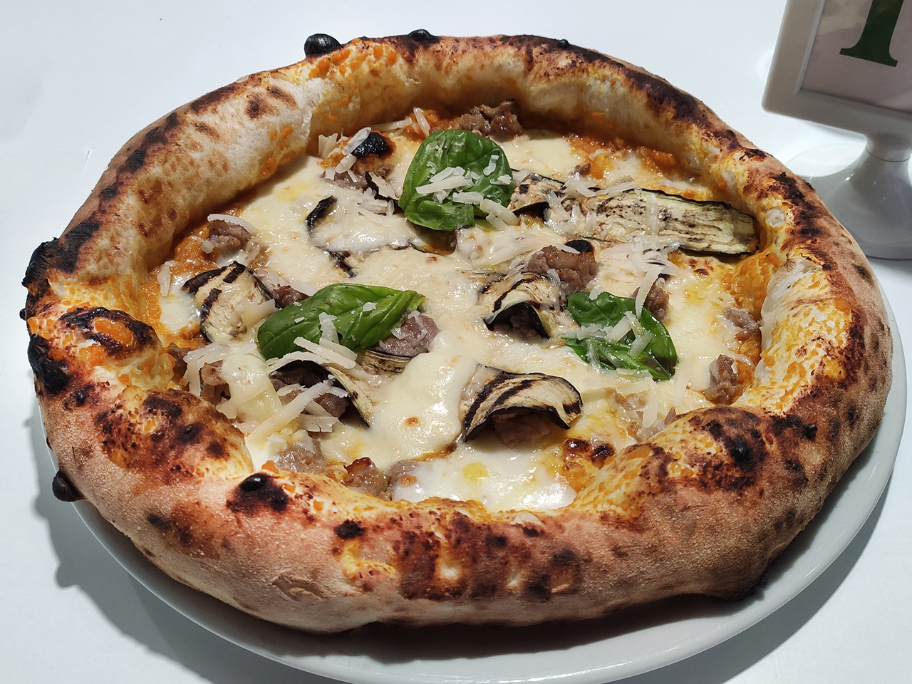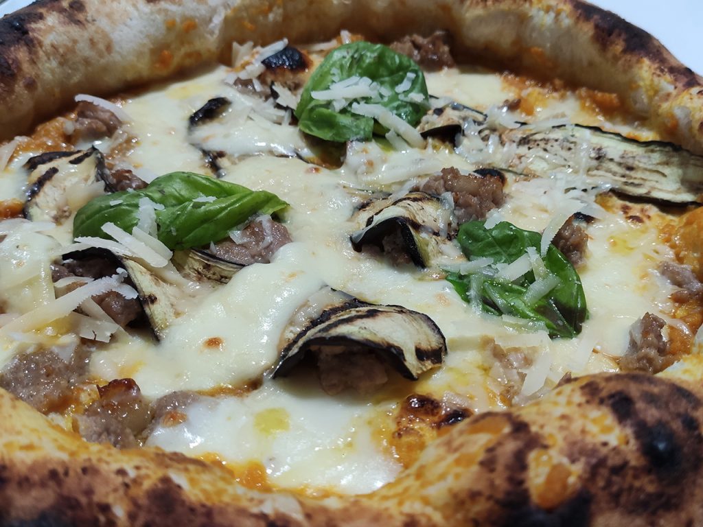 Dopo questo ricco e saporito antipasto siamo passati alla pizza che possiamo inserire nella categoria pizza contemporanea (o pizza a canotto), cornicione molto pronunciato, alveolato e morbidissimo. La prima pizza servita è stata una classicissima margherita mentre come seconda pizza, Antonio ha sfoderato tutta la sua creatività proponendo una loro speciale con provola di Agerola, salsiccia, vellutata di zucca, melanzane grigliate e scaglie di parmigiano.