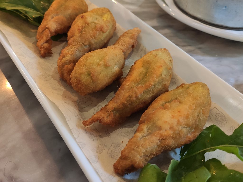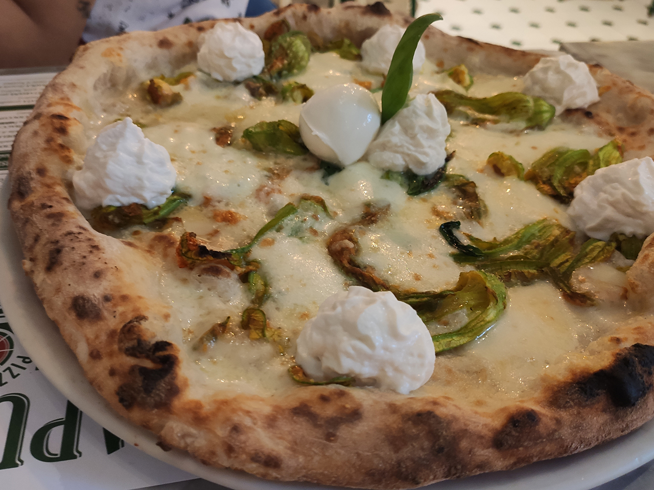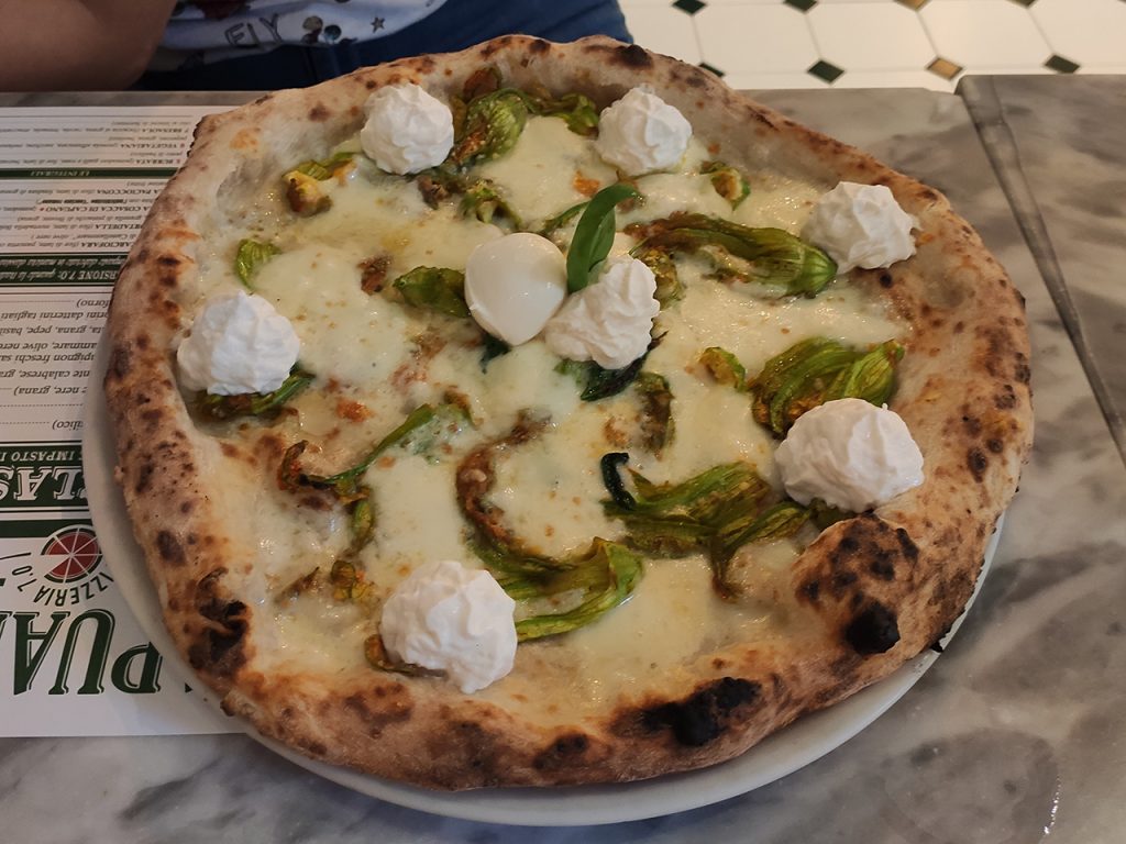 Ma come da prassi prima di mangiare la pizze, ho preso un antipasto, e quindi consigliato dalla ragazza che mi ha servito ho scelto dei fiori di zucca fritti in pastella ripieni di ricotta di bufala, grana, pepe e fior di latte. Fritto molto asciutto, saporito e poi questi fiori di zucca cosi farciti mi hanno fatto esplodere la papille gustative.