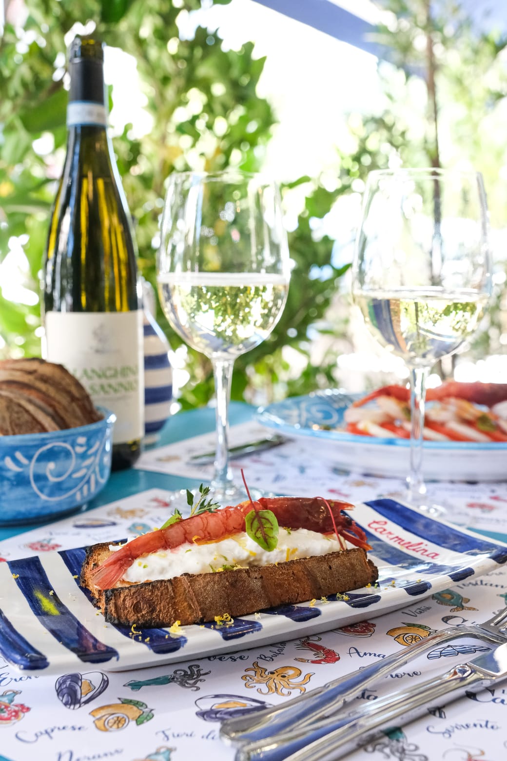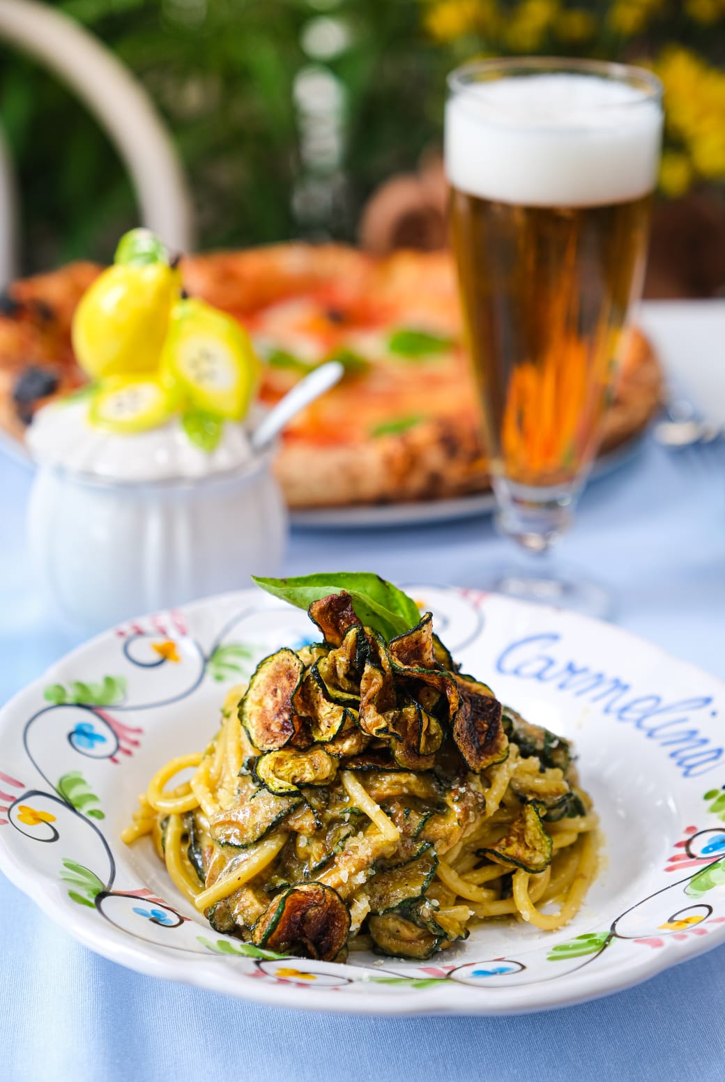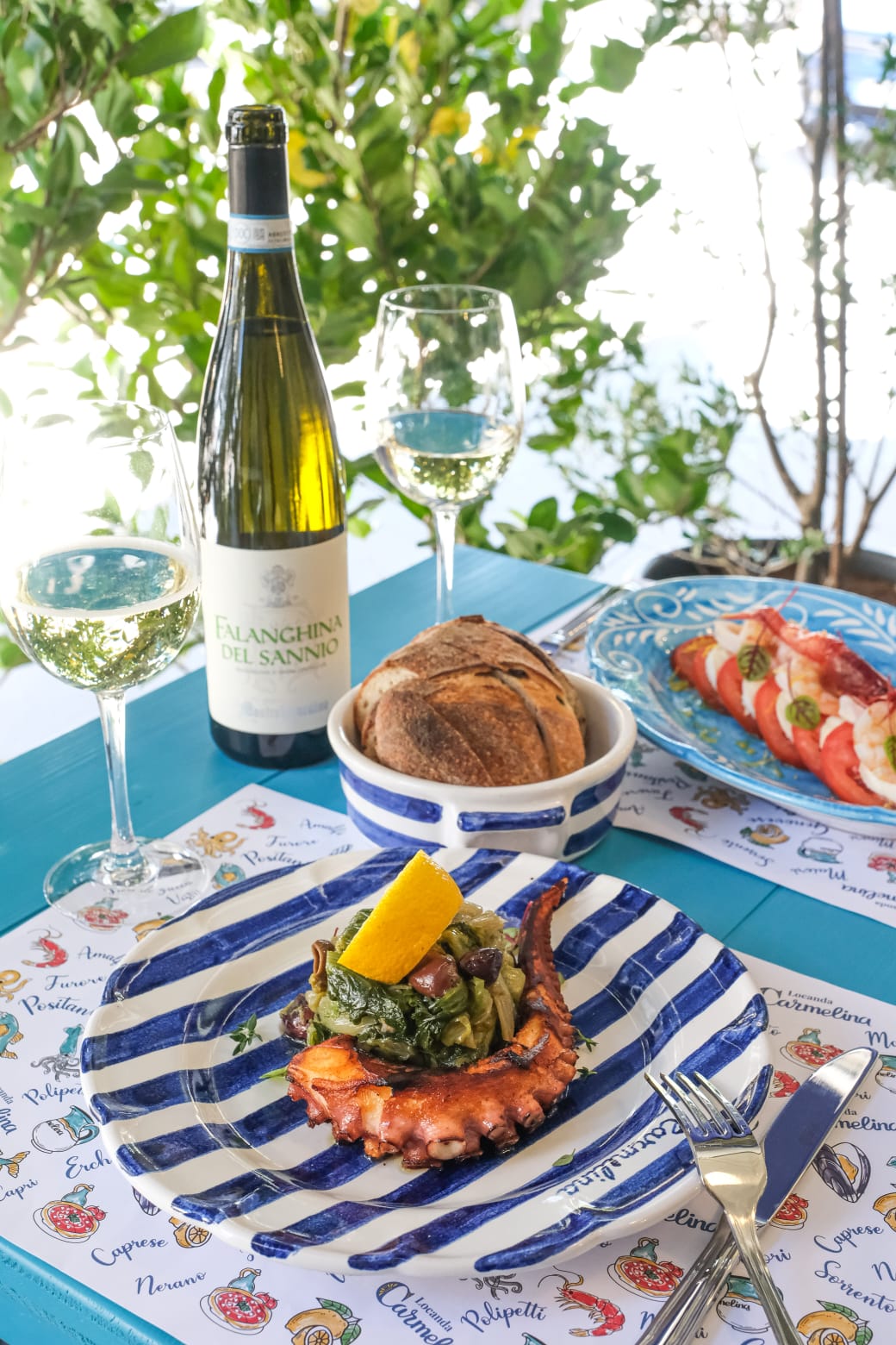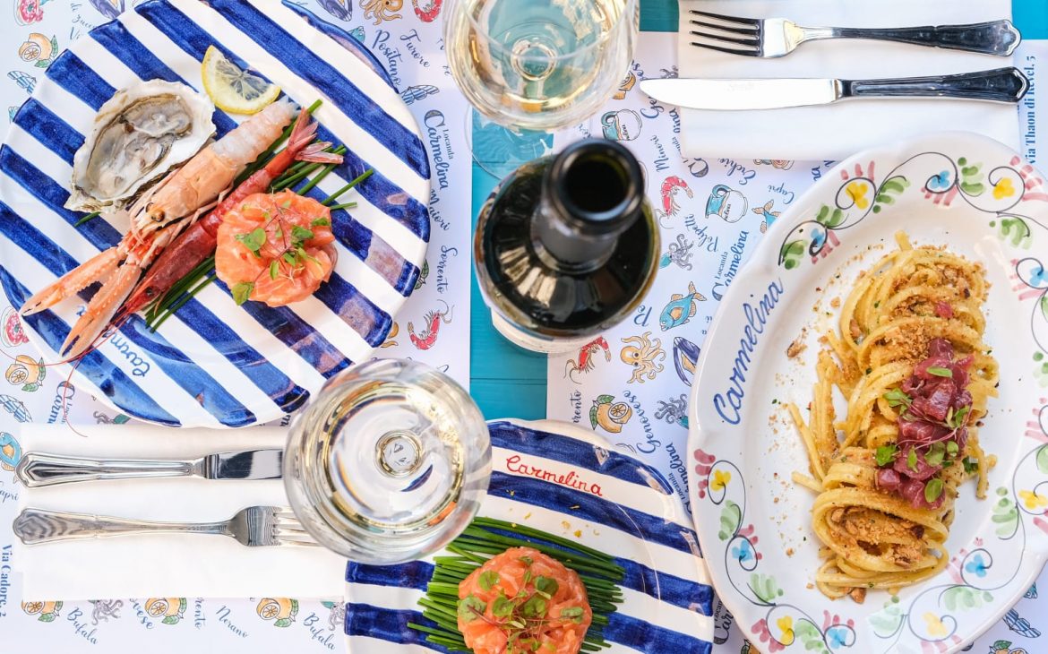Come detto Locanda Carmelina propone i migliori piatti della cucina Napoletana tradizionale, come l’immancabile pasta e patate con provola e guanciale, linguine con le vongole e bottarga, ziti alla genovese e quella che è per me uno dei miei piatti preferiti che Locanda Carmelina realizza alla perfezione ovvero gli spaghetti alla Nerano. Oltre ai primi piatti non mancano i vari sfizi fritti come fiori di zucca fritti ripieni di ricotta di bufala, e montanara fritta con pomodoro e parmigiano, ma anche veri e propri antipasti come ad esempio il bruschettone stracciatella, gambero rosso crudo e pepe e la classica parmigiana di melenzane. Come secondi piatti troviamo ad esempio il tentacolo di polpo croccante con scarole, olive e capperi, polpette al ragù e polipetti alla luciana con crostini.