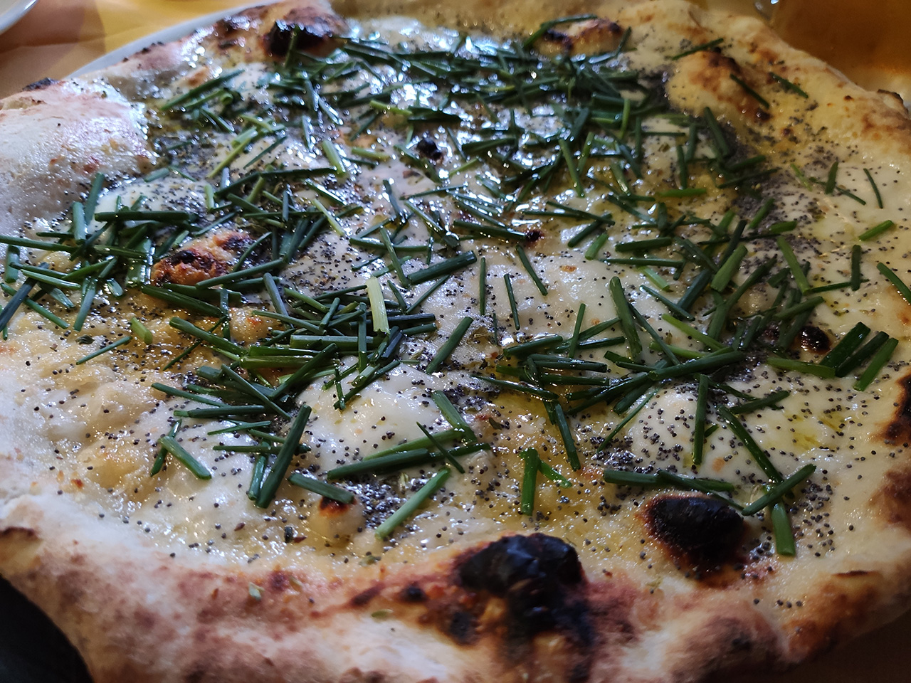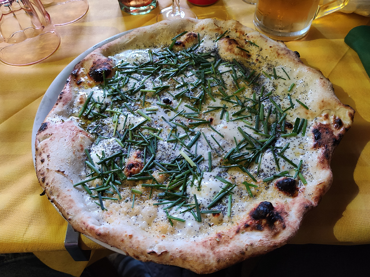 Di fronte mi sono trovate un impasto molto diverso da quelli a cui ero abituato di solito. Infatti non è ne una tradizionale napoletana ne una pizza contemporanea ne una rot’ ‘e carrett’. La pizza di Pasquale Pometto è un mix fra due tipologia di impasti ovvero quello tradizionale napoletano e quello della pinsa romana lievitato per 48 ore. Il risultato è una pizza molto sottile (anche il cornicione) leggerissima, molto digeribile e dalla stesura volutamente irregolare. Credo che questa sia stata una delle pizze più leggere che io abbia mai mangiato, e per quanto mi riguarda questo è un pregio che non molte pizzerie possono vantare.