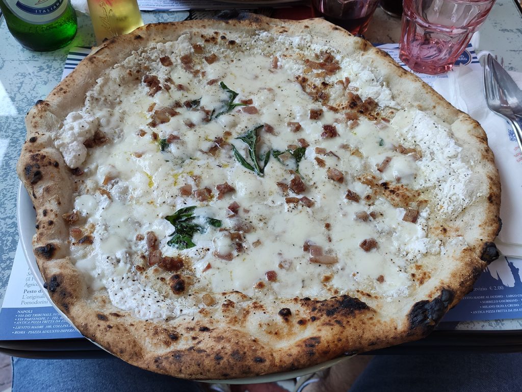 Detto questo passiamo alla fine della giornata, dove finalmente dopo tre lunghi mesi sono ritornato a mangiare una pizza fuori. Questo mi era mancato particolarmente: sedermi, prendere il menu, scegliere cosa mangiare e gustarmi la mia pizza. Come detto ho scelto Sorbillo Lievito Madre al Duomo e ovviamente anche qui la situazione non è come la ricordavo. Tavoli distanti (anche all’aperto) misurazione febbre, dispenser per disinfettare mani e un silenzio davvero surreale, anche se i tavoli erano quasi tutti pieni.